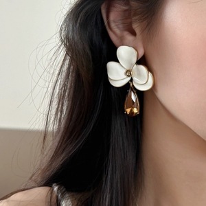 ホワイトペタルクリスタルドロップピアス(S925シルバー針)