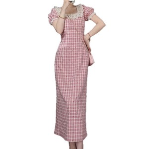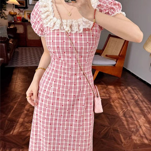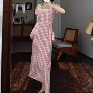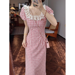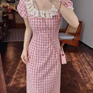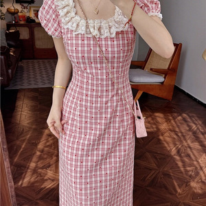 プラスサイズファットmmフレンチレトロレースレッドチェック柄ラブチェック柄ドレス女性の夏のウエストを細くし、お腹をカバーし、スリムに見せるロングスカート