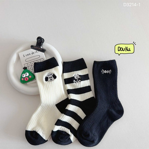 2逗库2025秋冬中筒袜男女宝童袜韩系黑白小狗棉袜2-12岁D3214-1
