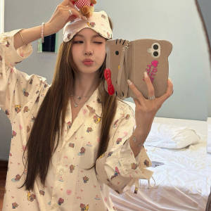 甜美少女卡通Kitty猫冰丝缎面睡衣女款夏季大码长袖长裤家居服ins