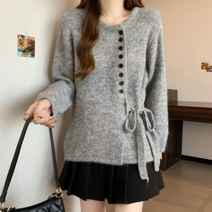 女性のためのデザインされたレースアップニットセーター 2025 新しい韓国スタイルの柔らかくワックスのようなルーズスリムラウンドネック長袖トップ