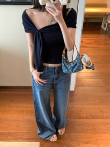 e go studo 天丝一字肩T恤女独特别致时尚设计精致气质短袖上衣