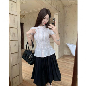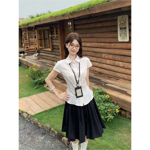 少女感时尚套装女百搭条纹翻领小飞袖短袖衬衫A字日系百褶半身裙