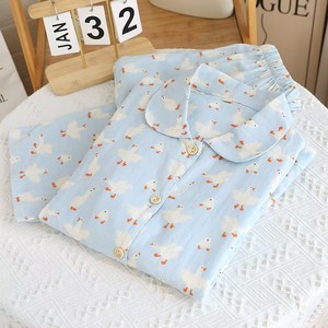 蓝色大鹅双层棉纱睡衣女纯棉四季开衫家居服韩版卡通睡衣套装现货