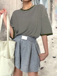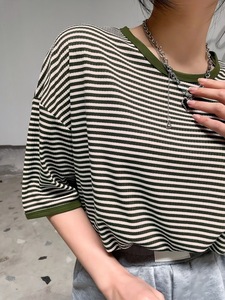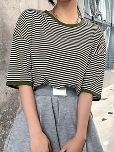 希音爆款韩国条纹袖女夏季T恤宽松百搭圆领中袖体恤衫韩版潮流ins