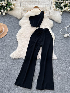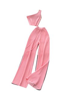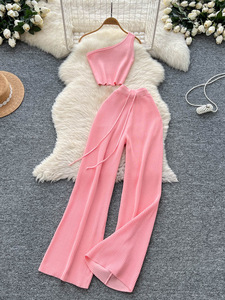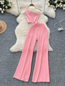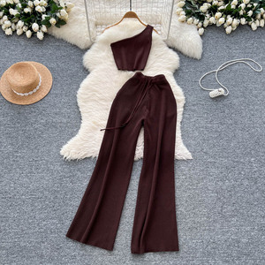 休闲运动针织套装女夏季设计感无袖斜肩小背心高腰竖纹阔腿直筒裤
