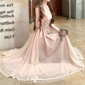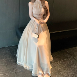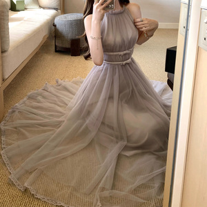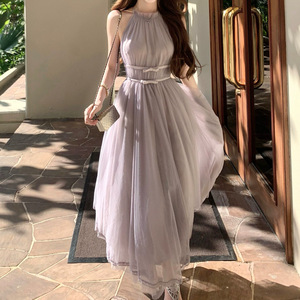 25/ss シャーベットほろ酔いロングプラスカラー!ヌードパウダーミストパープルホルターネック不規則なドレスリボン女性用