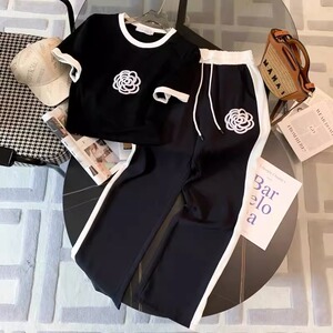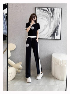 2025大码休闲运动套装女夏季时尚减龄拼接时髦炸街阔腿裤两件套潮