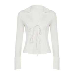欧美外贸白色翻边V领绑带收腰衬衫上衣秋季新品辣妹褶皱修身T恤女