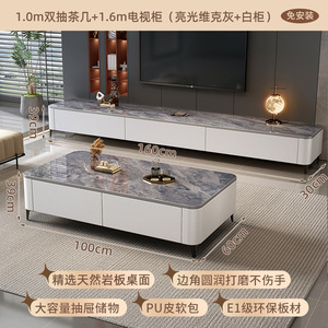 【免安装】1.0m双抽茶几+1.6m电视柜(亮光雪山白+灰柜软包)