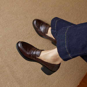 英伦风复古羊皮乐福鞋女粗中跟一脚蹬黑色百搭小皮鞋圆头软底单鞋