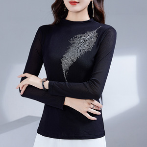 秋冬の女性用ホットドリルメッシュボトムシャツ、新しいスタイルの外国風ガーゼシャツ、無地の万能長袖Tシャツ