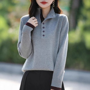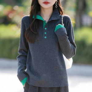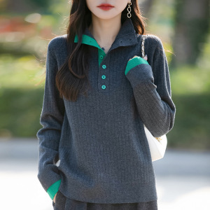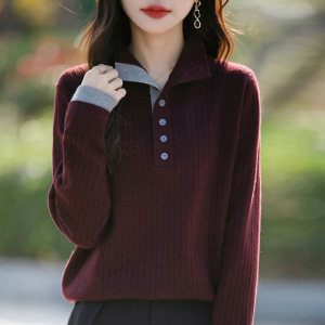复古撞色半开领坑条假两件针织衫女2025新款春秋宽松时尚长袖毛衣