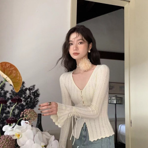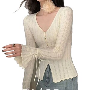 法式秋季新款纽扣V领镂空显瘦上衣女韩版气质喇叭袖绑带针织衫潮