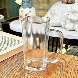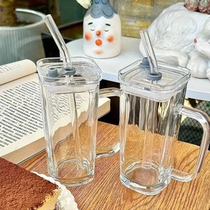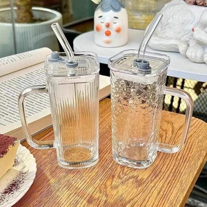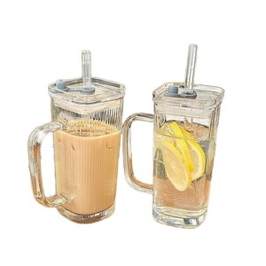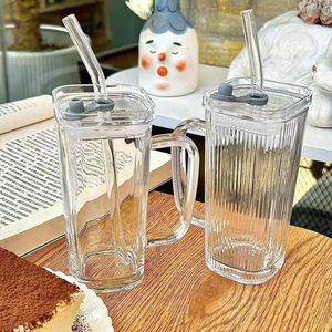 透明带把手玻璃水杯高颜值女夏季果汁饮料杯条纹带盖吸管杯子