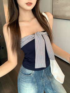 复古条纹系带一字肩抹胸背心女2025夏季新款修身显瘦裹胸短款上衣