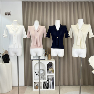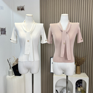 韓国ヒロインテンセルコアスパン糸リボンゴールドバックルスリムフィットセーターVネックミッドスリーブトップ女性用