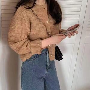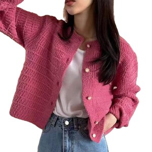 韩国chic秋冬复古毛衣开衫小香风圆领纹理编织感设计宽松长袖短款