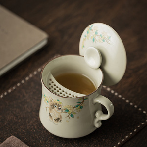 仿古汝窑黄花猫月牙水杯家用办公室开片可养陶瓷茶水分离杯马克杯