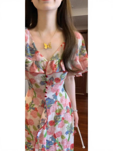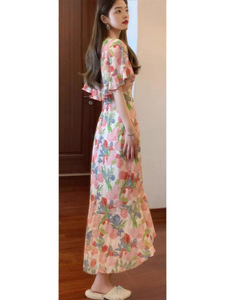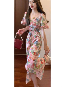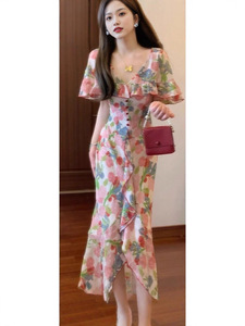 【芙罗拉】法式浪漫优雅荷叶边斗篷领碎花连衣裙收腰气质长裙9541