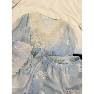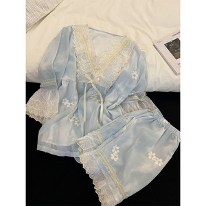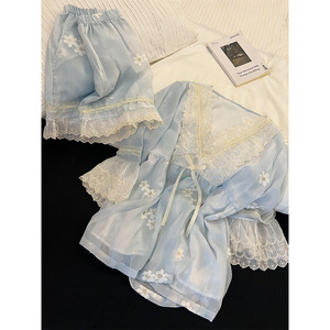 纯欲甜美蕾丝拼接网纱睡衣女夏季薄款大码亲肤短袖短裤家居服套装
