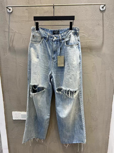 巴黎B家重工怀旧洗水工艺毛须挑破磨破宽松百搭破洞牛仔裤男女
