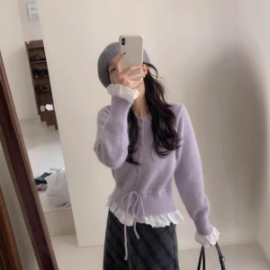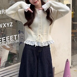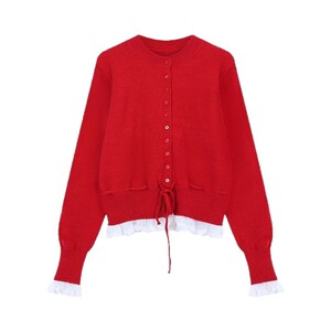 新年红色针织衫毛衣女冬季甜美风设计感荷叶边系带长袖打底衫上衣