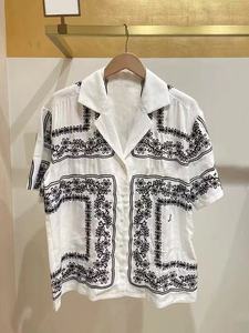 法式小众25年早秋新款复古刺绣撞色对称花西装领亚麻短袖衬衫上衣