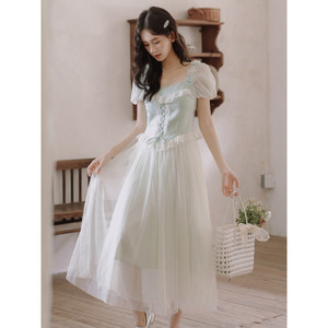少女心事法式少女感重工连衣裙2025夏新款泡泡短袖蕾丝拼接连衣裙