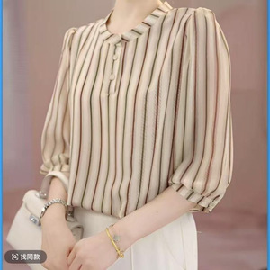 2025年夏の新作高級中高年ママ向けワンピースストライプトップスホワイトラウンドネックシャツ