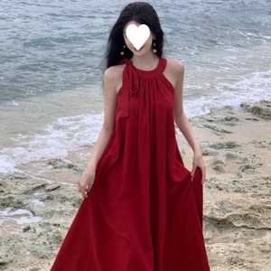 法式度假风无袖挂脖红色连衣裙女夏季云南三亚海边度假氛围感长裙