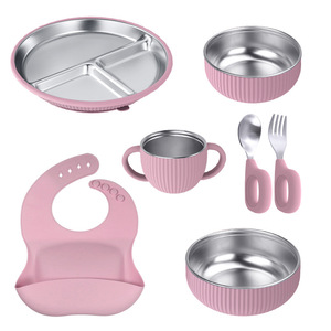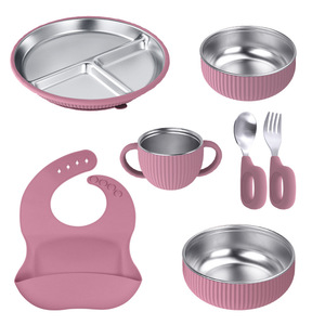 工場直販ステンレスシリコン子供用食器シリコンディナープレートボウルフォークスプーンよだれかけ食器ベビー食器セット