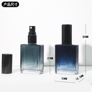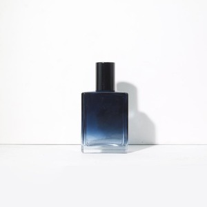 15ml(BF115); 青のグラデーションの平らな四角いボトル、黒いアルマイト処理されたアルミニウムのスプレーヘッド蓋付き、ガラス