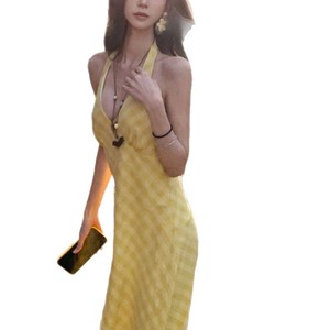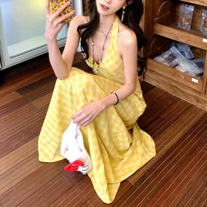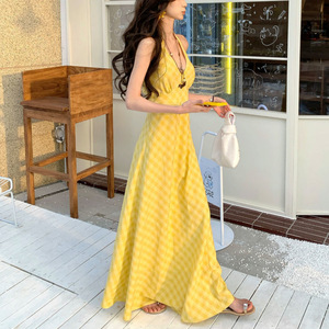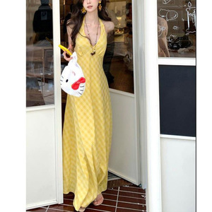 浪漫法式v领挂脖连衣裙女2025夏季新款设计感小众温柔度假风长裙