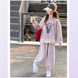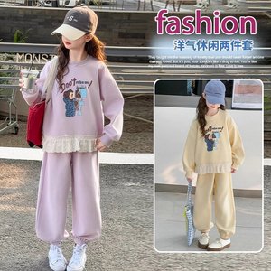 儿童春季新款棉质卫衣套装花边蕾丝女童卡通套装韩版中大童