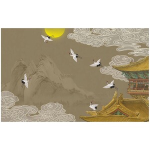 中式轻奢国潮客厅沙发5D电视背景墙壁纸仙鹤祥云阁楼墙布山水壁画