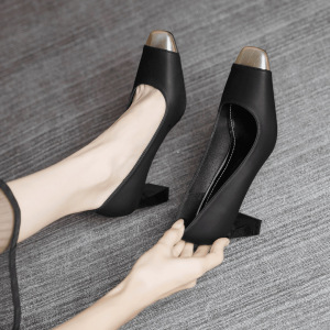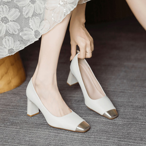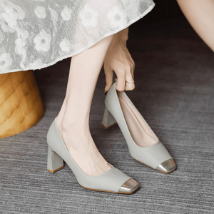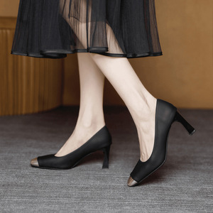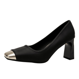 春秋新款优雅气质时尚女鞋拼色方头粗跟百搭高跟鞋浅口单鞋女