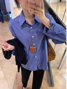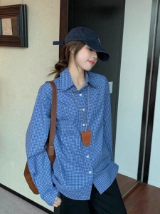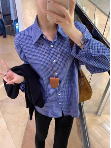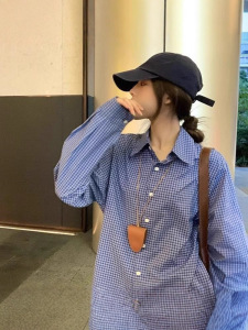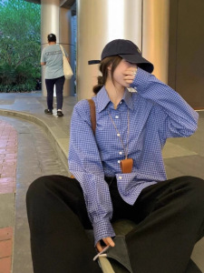 蓝色格子Polo领衬衫春秋季新款宽松开衫防晒长袖百搭显瘦上衣外套