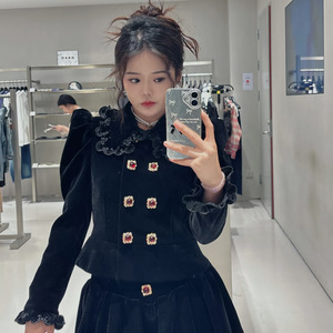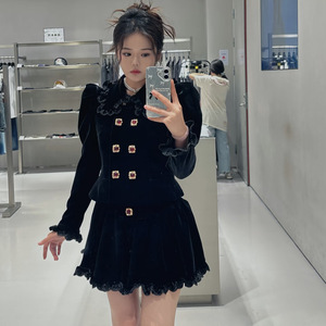 2025 初秋の新ファッションパフスリーブウエストスリムフィット宮殿スタイルベルベットショートコートトップ A ラインスカート