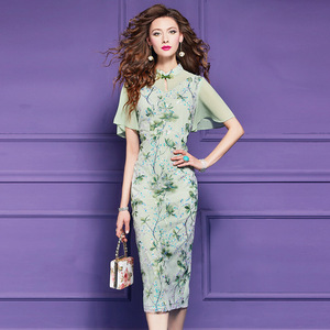 Feimengyi オリジナルグリーンプリントドレス女性の夏の国民風スタンドカラーファッション若いスタイル改良されたチャイナドレス