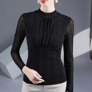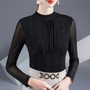 2025 春と秋のデザインプリーツボトリングシャツ女性のための新しいメッシュ長袖シャツ西洋スタイルインナートップ女性のための