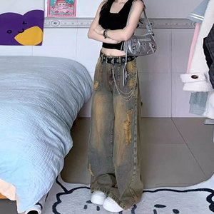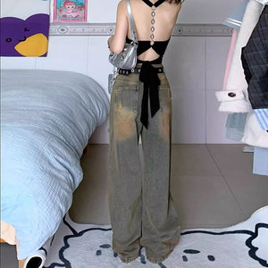 ホットガール 2025 新デザインブルーリップドワイドレッグジーンズ女性の夏のストリート多用途フロアレングスパンツ