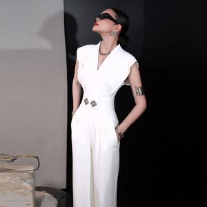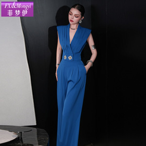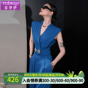 Feimengyi ハイエンドブルースーツスーツ女性の夏のファッション通勤ウエスト V ネックショートトップワイドレッグパンツ