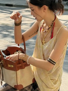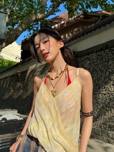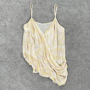 「100% レーヨン生地」ダイレクト インクジェット プリント Nanyou 婦人服卸売ホリデー スタイル ライトイエロー プリーツ花柄サスペンダー