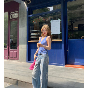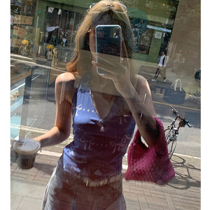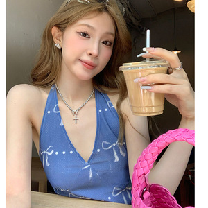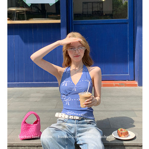 2025夏新款辣妹小众设计感蝴蝶结印花挂脖吊带背心女修身显瘦上衣