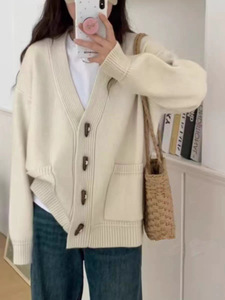 2025 秋冬新スタイルホーンボタンニットカーディガン女性の韓国スタイルルーズシンプルカジュアル怠惰なスタイルのセータージャケット