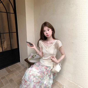 2025夏季新款甜美风收腰蕾丝拼接短袖T恤