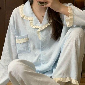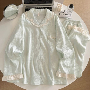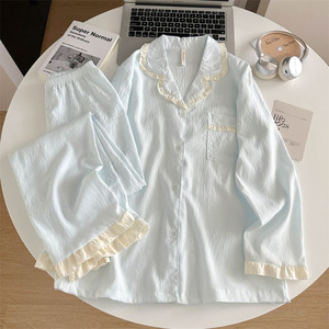 花边睡衣女春秋季云朵棉长袖长裤开衫纯色可外穿大码家居服套装