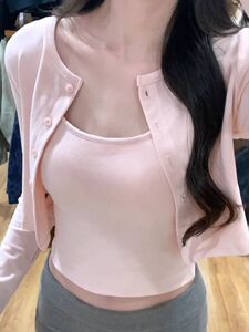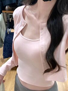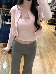韓国風 ピンク 優しいスタイル 長袖 Tシャツ レディース 初秋 新作 小柄 スリム トップス 2点セット