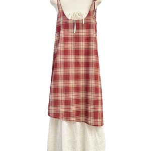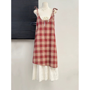 リゾートスタイルのレースアップチェック柄サスペンダードレス女性の夏の新しい偽ツーピースコントラストカラーステッチ気質ミドル丈スカート